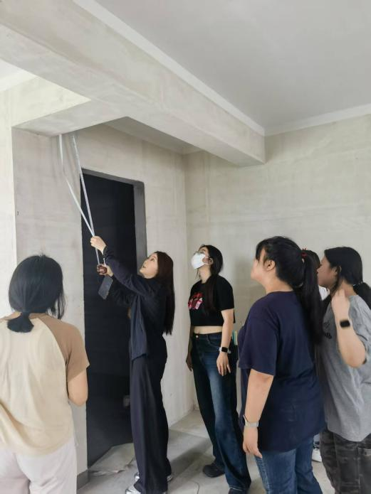 实训前期阶段,员工们前往校外实训基地开展实地量房学习。企业选派资深设计师担任导师,现场讲解量房规范、数据记录要点及客户需求沟通技巧。员工们分组操作在真实工地上完成户型测量与数据采集。“企业导师手把手教我们规避现场量房的常见错误,这种实战经验是课堂上学不到的。”员工丁梦霞感慨道。