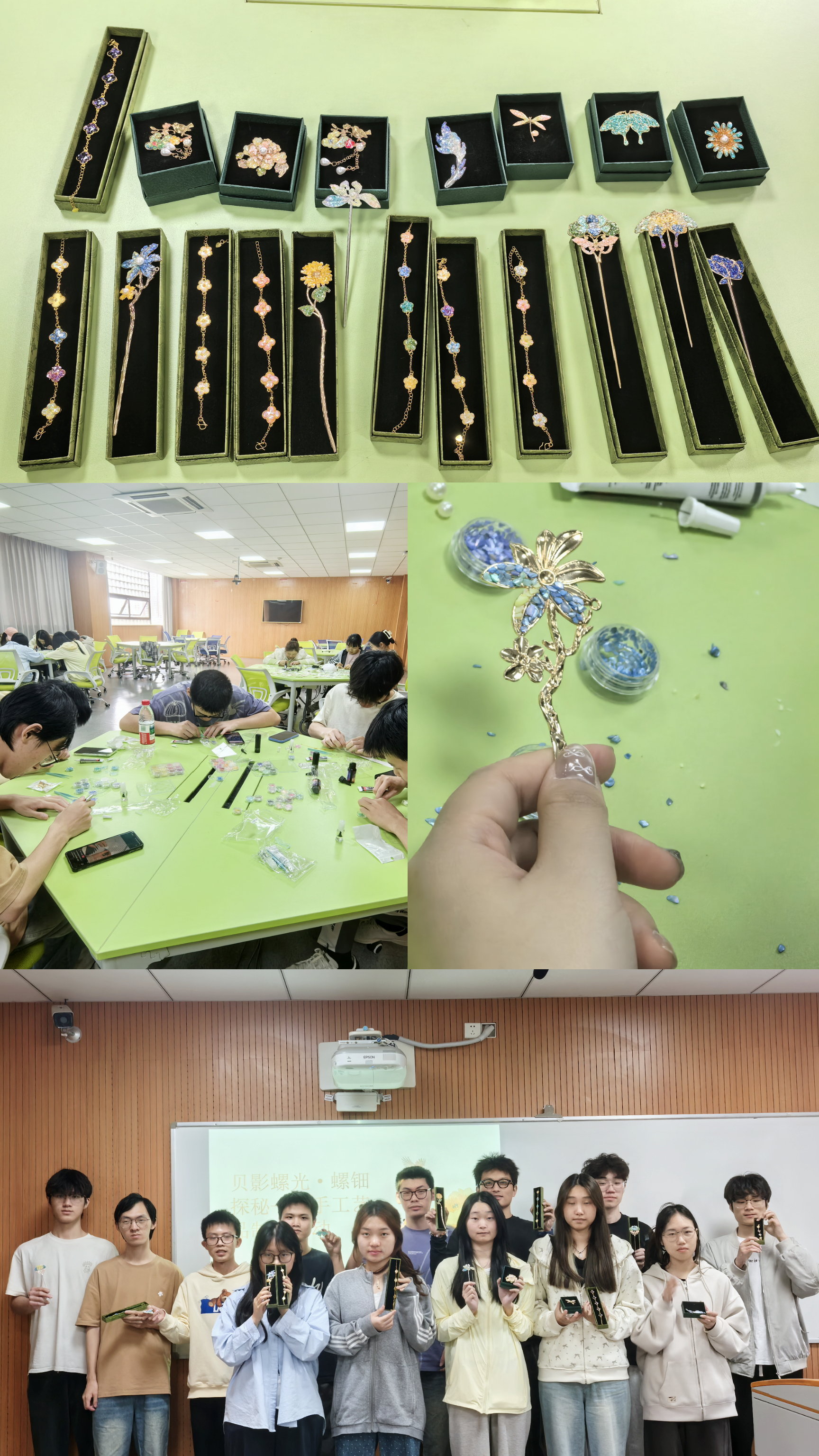 活动结束后,一件件精美的螺钿饰品呈现在眼前。有造型别致、古韵悠然的发簪;美观实用、时尚大气的胸针;精致小巧、灵动俏皮的耳环;颜色各异、绚丽多彩的手链。这些作品色彩斑斓、流光溢彩,既展现了同学们的艺术才华,又体现了对传统文化的创新诠释。