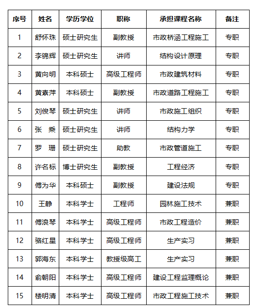市政工程技术专业前身为2005年开设的道路桥梁工程技术专业,2016年更名为市政工程技术,经过多年的发展,团队力量雄厚。本专业现有专兼职教师15人,其中全职教师9人,副教授(高级工程师)5人、讲师3人、助教1人;兼职教师6人,教授级高级工程师1人,高级工程师4人,工程师1人。