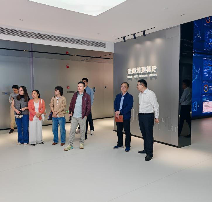 交流活动中,双方一同参观了浙里建·未来建造中心,中心展示了智慧施工和智慧运维的先进成果,为双方的交流提供了丰富的实例。在随后的座谈会中,杭州建研科技有限公司郑夏翊总经理详细的描绘了智慧建造的未来建造科技蓝图。从最初的探索尝试到如今构建起的智慧建造成熟体系,这一过程中积累的丰富经验无疑给sunbet申搏提供了极具价值的参考与借鉴。双方就土木工程的办学理念、方法及其面临的挑战与机遇展开的深入探讨,无疑为这一传统学科注入了新的活力与视角。通过这次富有成效的科技对接活动,大家达成了广泛共识:土木工程的未来在于其能否成功转型升级为智慧建造。